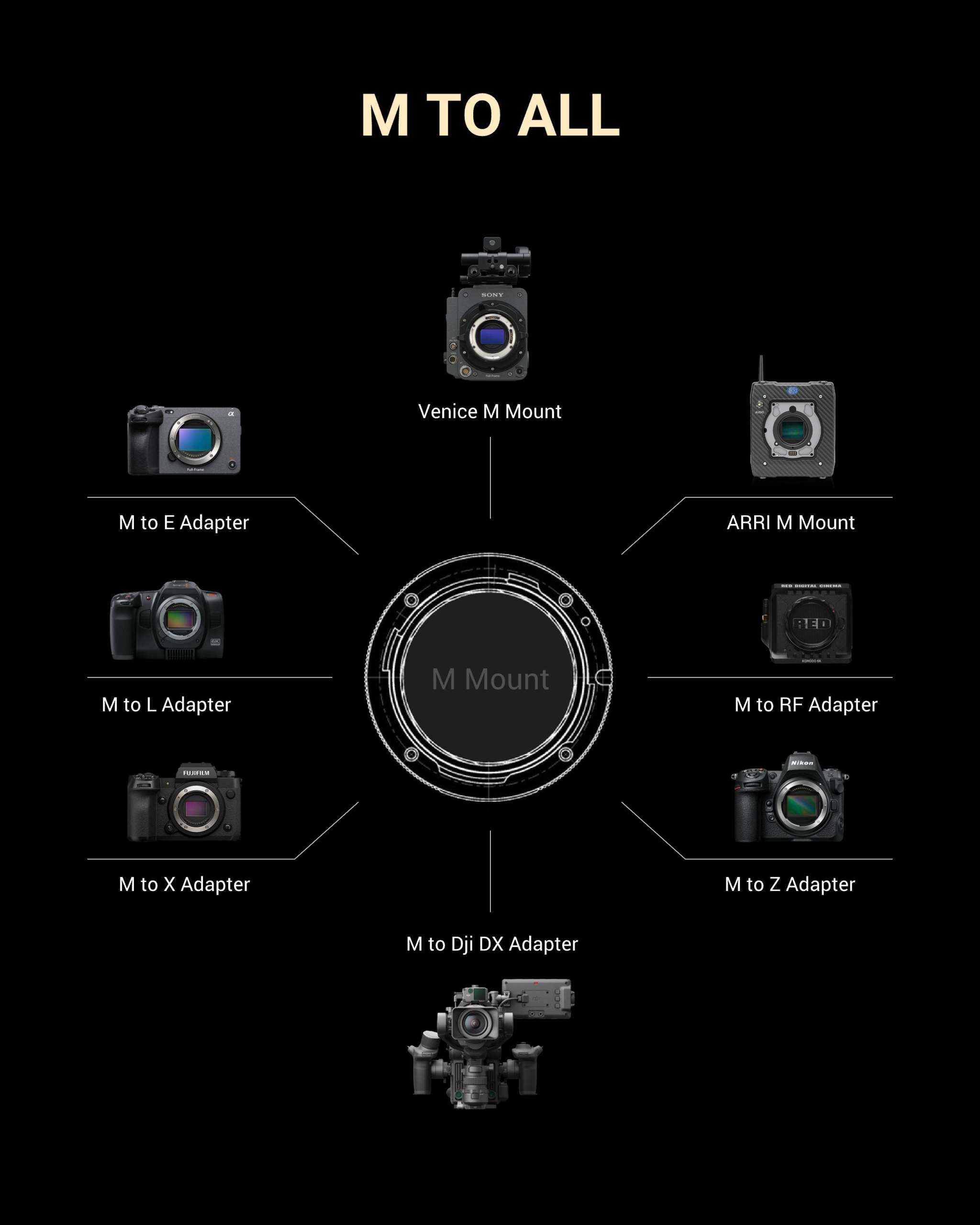 With standard M-mount adapters, Simera-C lenses can adapt to various mirrorless cameras (E, RF, Z, L, X mounts) for cross-system use. With a locking M-ARRI adapter, they are also compatible with ARRI ALEXA Mini LF, ALEXA Mini, AMIRA and other ARRI systems. This exceptional compatibility makes it easy to work with everything from entry-level mirrorless cameras to high-end cinema rigs like DJI Ronin 4D, Sony Venice, ARRI, and more.